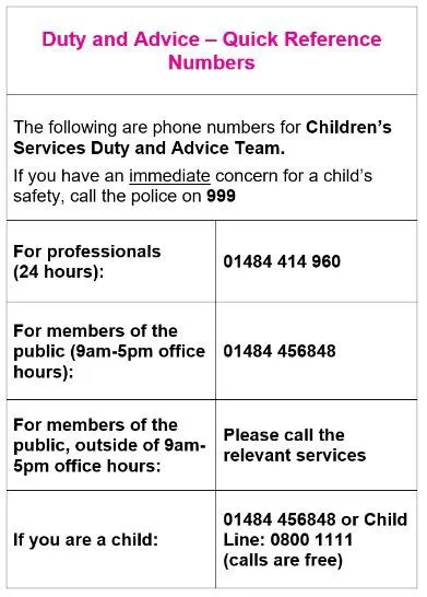 If you think a child in Kirklees is being abused or mistreated or you have concerns about a child's wellbeing or need advice and support about a child with a disability you should call and speak to someone on one of the following numbers: